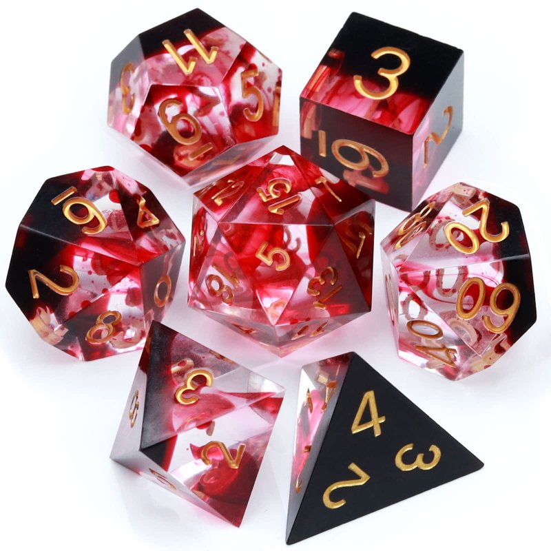 Beautiful sharp edge resin polyhedral dice set w/ blood effect swirls for d&d, pathfinder.