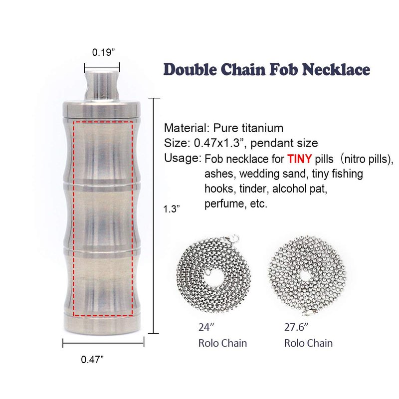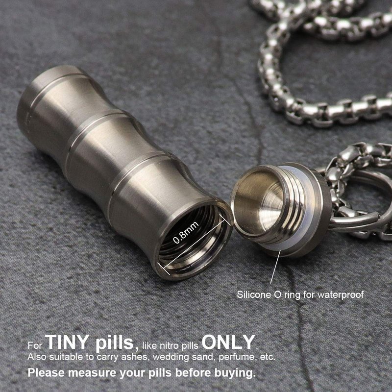 - Pure Titanium Pill Holder Necklace for Tiny Tiny Tiny pills, please check the size before buying. Made of medical grade super strong titanium, which is perfectly compatible with human body. Non-toxic, non-allergenic and super lightweight.