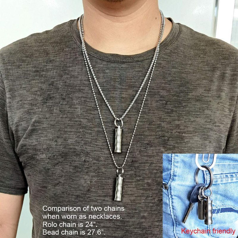 - Package inclue: 1x Titanium Pill Case, 2x Necklace Chains, 1x Key Ring(attached to case), Spare O rings
