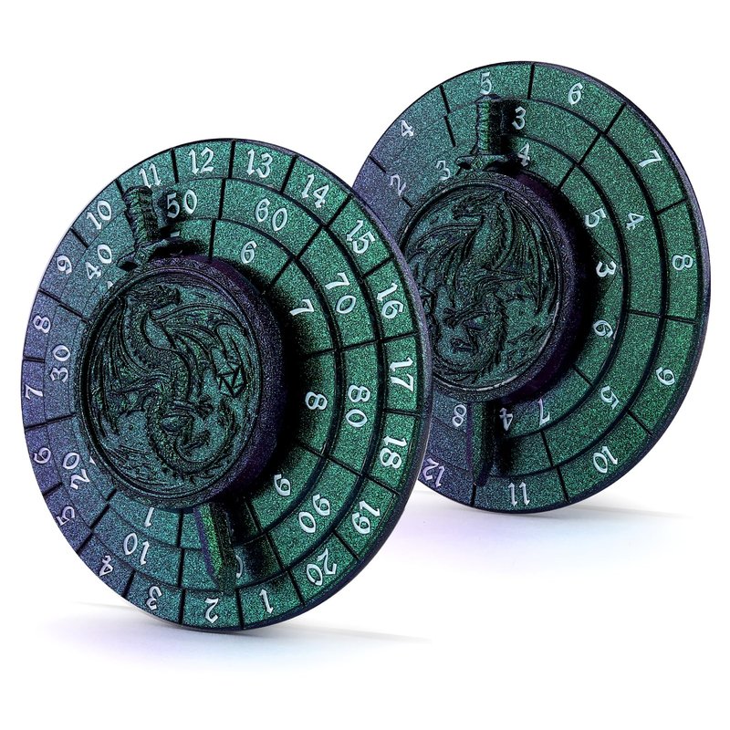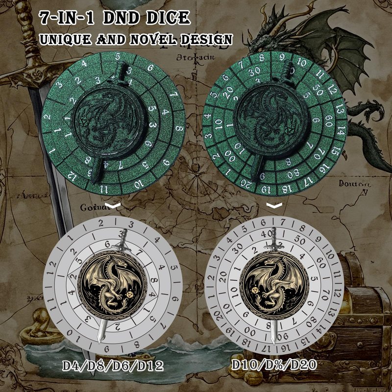 - Unique Spinner Dice: Combines a spinner dice with 7 dnd dice D4, D6, D8, D10, D12, D20 and D% into 1. Adorned with an engraved dragon motif and sword accent for a fantasy touch.