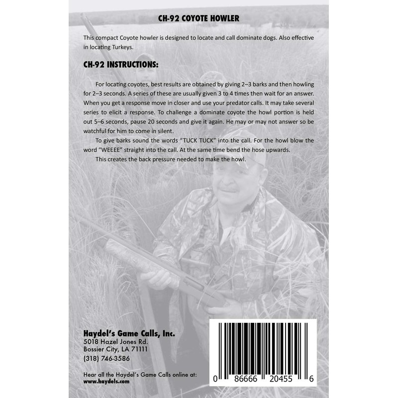 The CH-92 Coyote Howler Predator Call. This compact Coyote howler is designed to locate and call dominate dogs.