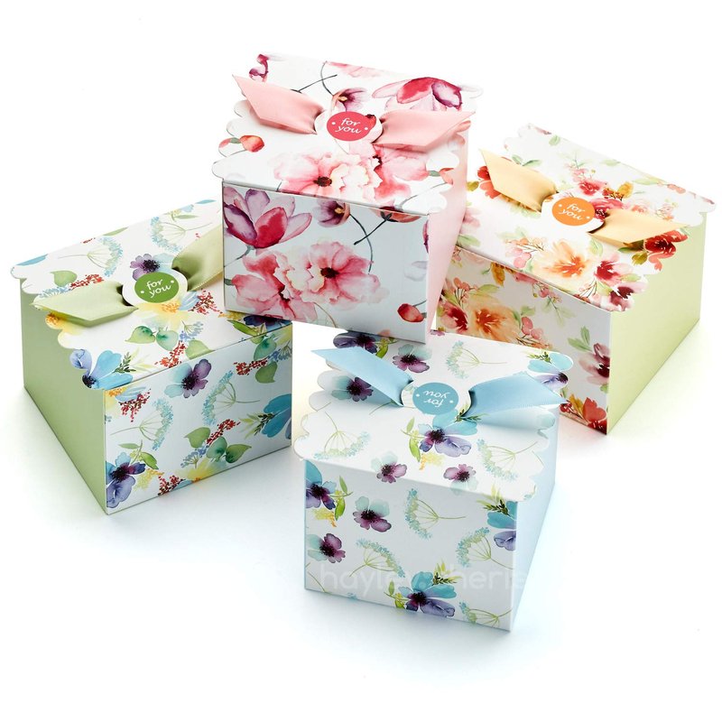 - BEAUTIFUL: Four unique flower designs are included with every set (5 of each design). The delightful floral patterns make these treat boxes fun and appealing for all types of occasions. The ribbons come in four different colors (green, orange, blue and pink) so you can mix and match the ribbons as you choose. Each box has a simple circular design saying "for you" on the top of the lid. Our designs are all unique, you won't find these boxes anywhere else!
