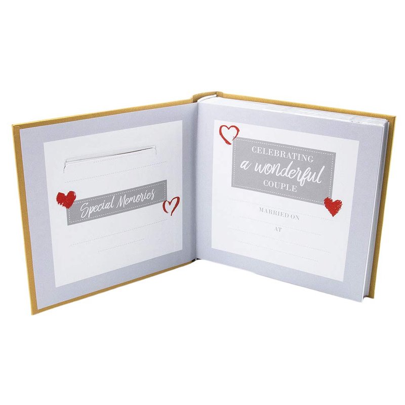 - The front lining pages are decorated with red hearts and spaces to enter the happy wedding day information. The actual album measures: 6.5"in height , 7" in width and 1" in depth.