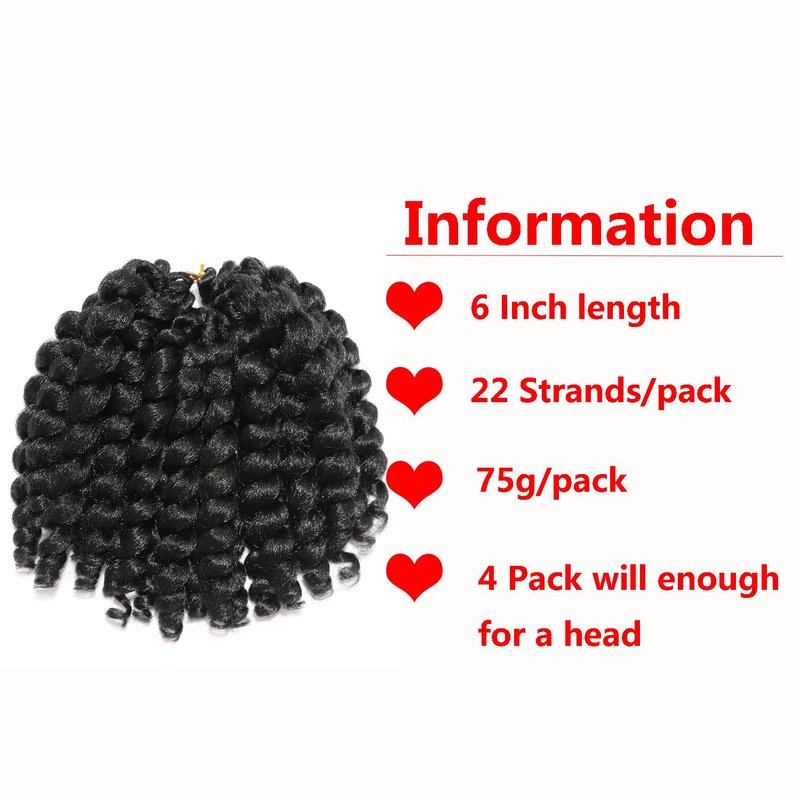 HBNK 6 Inch jamaican pounce Wand Curl Crochet Hair Is Made By High Quality Synthetic Hair with a Super Soft and Fluffy Hair Texture. Length: 6 Inch Weight:(75g±5g)/Pack. Available Colors: 1B, 4#, T30, T27, T350, T1B-Gray,T1B/30/27,More colors to come. Product:22 Strands/Pack,4 Packs/Lot. Usually 4 Packs Can Full A Head. Package: 4 Packs Wand Curl Crochet Hair + 1 Crochet Needle