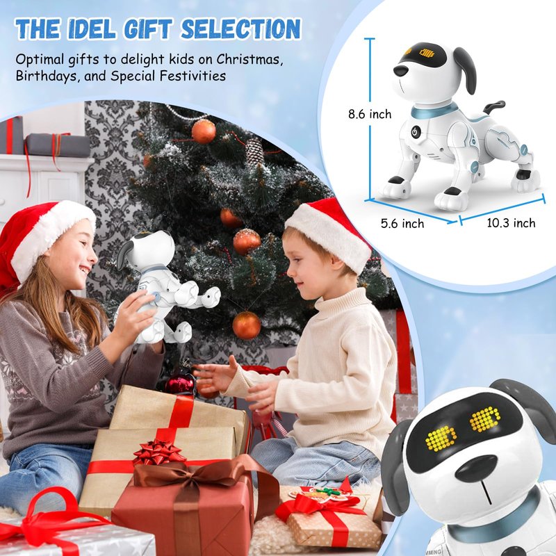 - 🌻[Intelligent & Interactive Robotic Puppy] Touch the chin of the walking dog to perform a cute gesture and makes a sound and interacts with you. You can program the actions as you like through the remote control and then the dog will follow the commands. The dog toys for kids have 3 set of dance routines and dances along music. Perfect robot pets for both boys and girls.