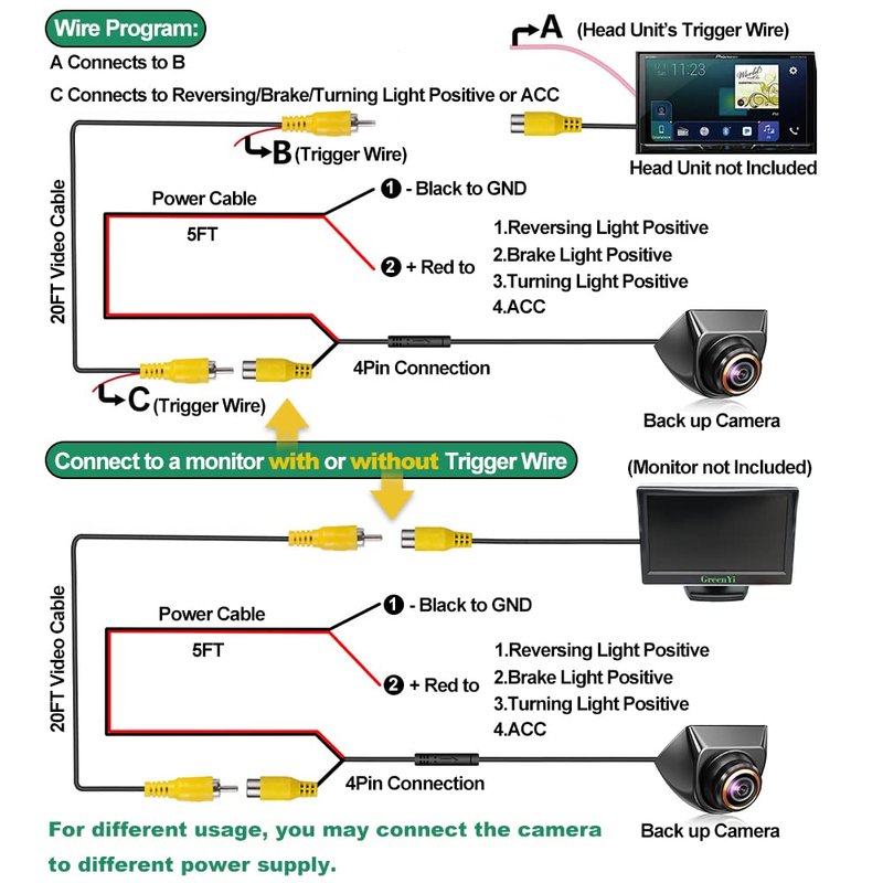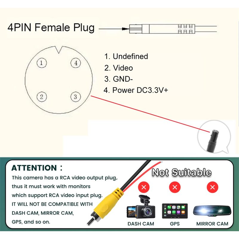 - 4Pin Backup Camera---Please note that all of our 4pin backup cameras can't be connected directly with any other monitors(no matter DVR or dashcam or whatever) which is not compatible with RCA video input AS the pin definition is different.