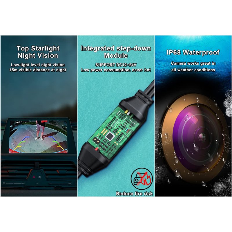 - Back up Camera with Golden Rim on Fisheye Lens---Eye-catching gloden rim makes the camera unique, 170 degrees wide viewing angle covering most blind spot area. High Definition 1280x720p reversing camera for car is compatible with all monitors which supports RCA video input: double din stereo radio head unit, OEM navigation, Android DVD player, rear view mirror monitor, backup TFT LCD monitor, etc.
