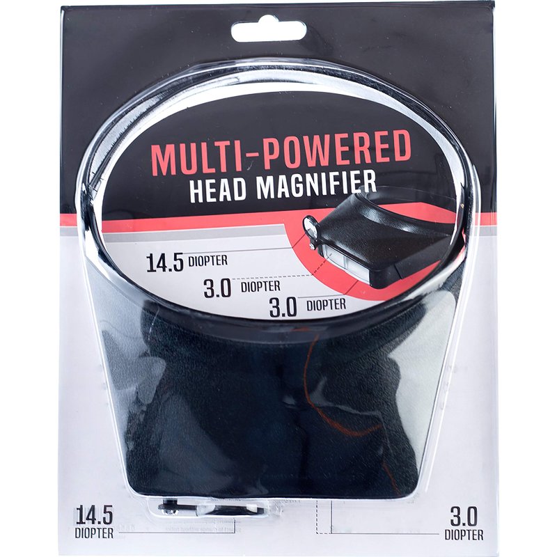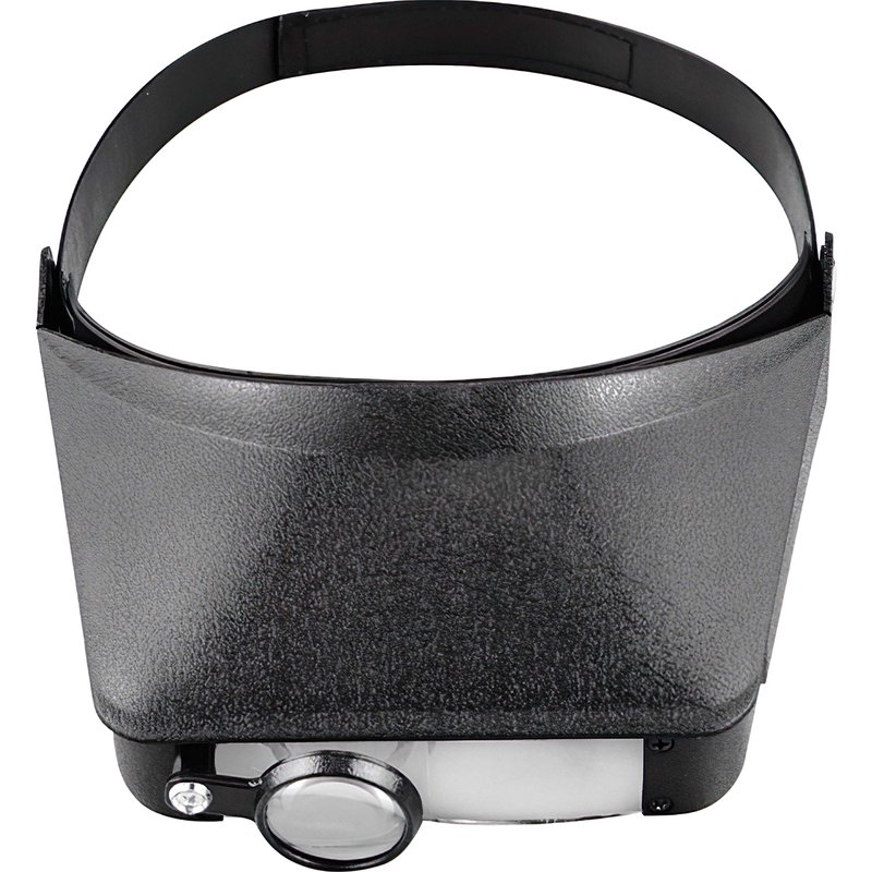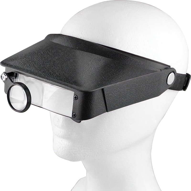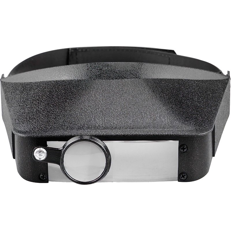 Headband magnifier This light-weight magnifier offers four magnifications in one The magnifier is equipped with a 1.8X and 2.3X double lenses that if used together have a magnification of 3.7X By bringing down the spare lens, the user can change the magnification If the flip down loop is used, magnification goes to 4.8X power The inner auxiliary lens flips up inside headband when not in use The head band magnifier makes it easy to see fine objects and do precision inspection when necessary Has an adjustable hook and loop strap making it easy to adjust to any head size