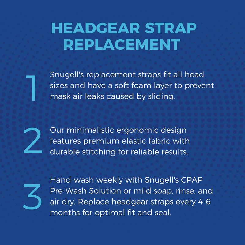 - EASY CARE: Hand-wash every week using Snugell’s CPAP Pre-Wash Solution or a mild soap, rinse with warm water, and let dry away from direct sun light. For optimal fit and mask seal, headgear straps should be replaced every 4-6 months.