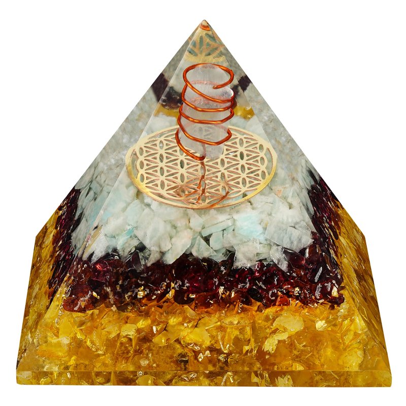 - CRYSTAL PYRAMID BENEFITS This pyramid is a blend of multiple types of crystal beads, each with their own unique properties. This Clear Quartz, Citrine & Garnet Orgonite Pyramid is believed to bring good luck & promoting positive & harmonious environment to the space where they are placed.