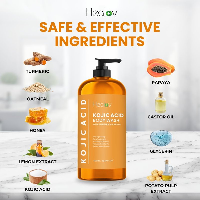 - PURE KOJIC ACID BODYWASH: This all-natural ingredient is sourced from fermented rice, commonly used in Japanese sake. Kojic acid soap is a skincare extract known to assist with issues like melasma, age spots, sun damage, and discoloration.