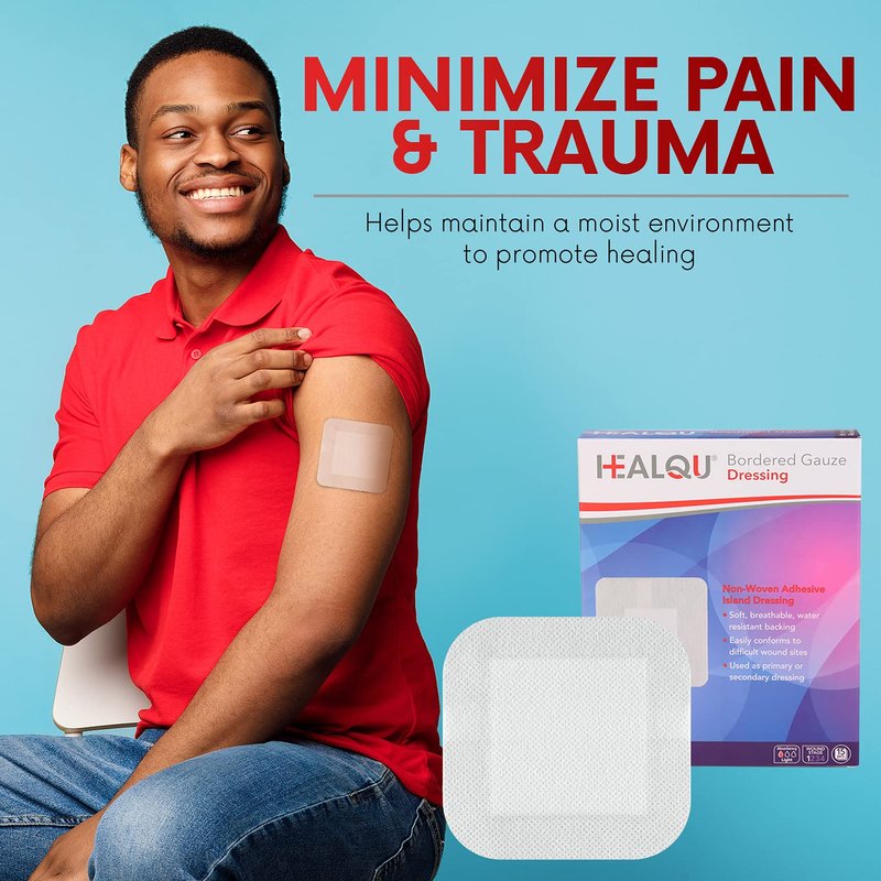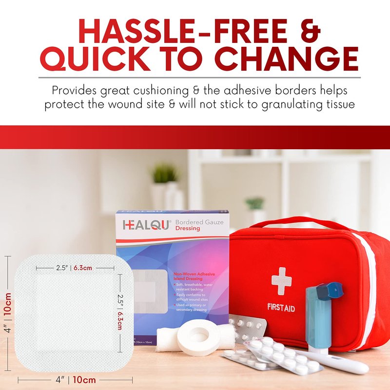 - QUICK & EASY TO USE! Sticky around the edges but not in the middle, Healqu Bordered Gauze Island Dressings protect fresh cuts and scrapes without sticking to the wound, for good protection while healing. Simply peel & stick, and get on with the rest of your day!