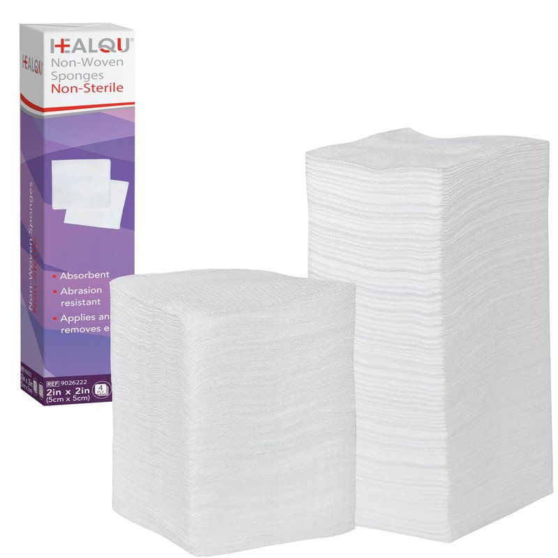- ULTRA ABSORBENT GAUZE SPONGES - HEALQU Non-Woven Gauze Sponges feature 4-ply (8 layers) thickness made from loosely Non-Woven cotton fiber. They effectively absorb fluids and exudate from the wound, which helps reduce the risk of infection and further expedite recovery time.