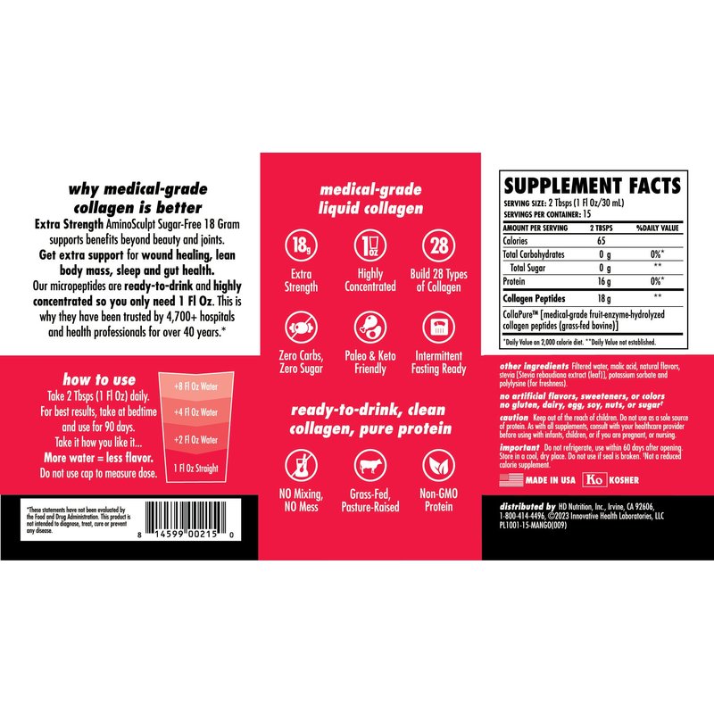 Health Direct AminoSculpt Sugar-Free Collagen Supplement - High Potency Medical-Grade Protein for Hair, Skin, Nails & Joints, Grass-Fed, Non-GMO, Liquid Collagen - Smooth Mango - 15 Fl Oz