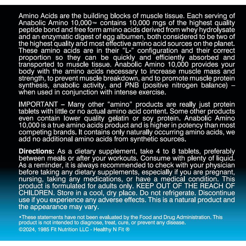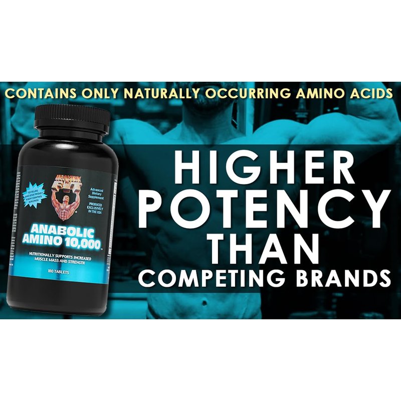 With over 100 million sold, Anabolic Amino 10,000 is clearly the athlete’s choice in Amino Acids technology, providing maximum nutritional support for increased muscle mass and strength, preventing muscle breakdown, enhancing recovery, promoting protein synthesis, promoting anabolic and anti-catabolic activity and PNB (Positive Nitrogen Balance). Derived from Whey Hydrolysate and Egg White Hydrolysate, the most effective Amino Acid sources that exist. Many other "amino" products are really just protein tablets with little or no amino acids content, some products even contain low quality gelatin or soy protein. Anabolic Amino 10,000 is the ultimate Amino Acids product, with GUARANTEED MAXIMUM RESULTS. Amino Acids are the building blocks of muscle tissue. Each serving of Anabolic Amino 10,000 contains 10,000 mgs of the highest quality peptide bond and free form amino acids derived from whey hydrolysate and an enzymatic digest of egg albumen, both considered to be two of the highest quality and most effective amino acid sources on the planet. These amino acids are in their "L-" configuration and their correct proportion so they can be quickly and efficiently absorbed and transported to muscle tissue. Anabolic Amino 10,000 provides your body with the amino acids necessary to increase muscle mass and strength, to prevent muscle breakdown, and to promote muscle protein synthesis, anabolic activity, and PNB (positive nitrogen balance) – when used in conjunction with intense exercise. IMPORTANT – Many other "amino" products are really just protein tablets with little or no actual amino acid content. Some other products even contain lower quality gelatin or soy protein. Anabolic Amino 10,000 is a true amino acids product and is higher in potency than most competing brands. It contains only naturally occurring amino acids, we add no additional amino acids from synthetic sources.