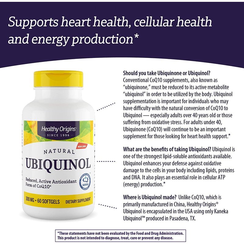Healthy Origins Ubiquinol (Active form of CoQ10), 300 mg - Activated Form of CoQ10 - Kaneka Ubiquinol Supplements for Heart Health & Antioxidant Support - Gluten-Free & Non-GMO - 60 Softgels