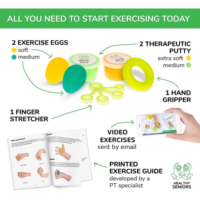 - Printed booklet with 24 exercises - the Healthy Seniors kit comes with a detailed set of exercises designed by a physical therapist to strengthen your fingers, hand, and wrist. You can do your rehab training exercises every day, gradually increasing the difficulty and improving your fine motor skills. Done regularly, these exercises will make it easier for you to grab different objects or do chores around the house, therefore improving the quality of your life.