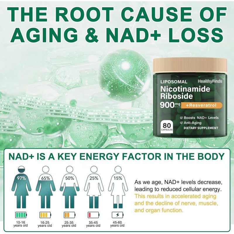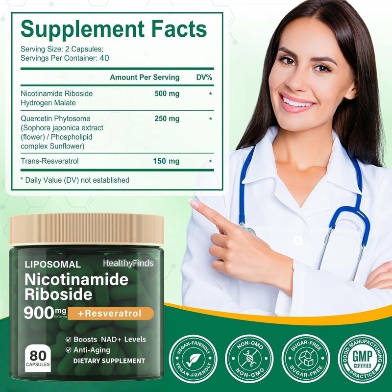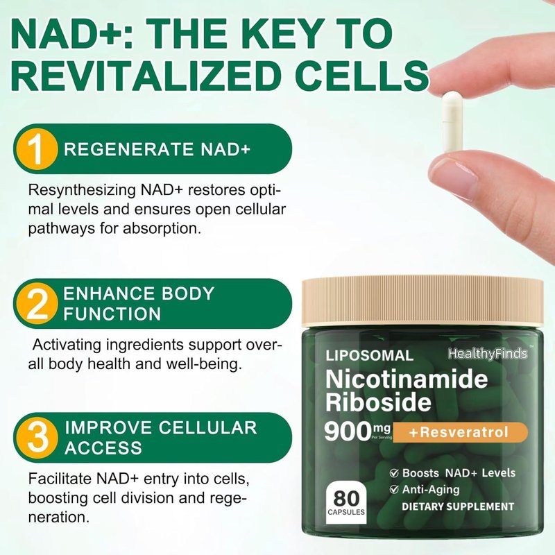 HealthyFinds NAD+ Supplement, 900mg Liposomal Nicotinamide Riboside, Resveratrol Quercetin, NMN Supplement Alternative for Anti-Aging, Energy, Focus, for Women & Men, 80 Capsules