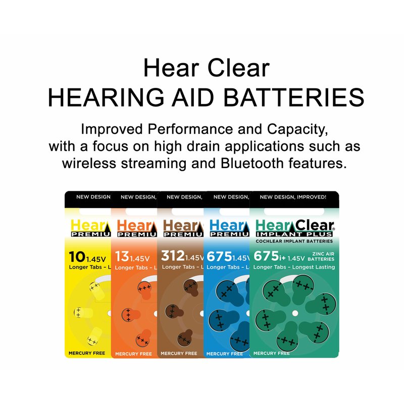 HearClear hearing aid batteries are backed with over 23 years of research and development, utilizing a unique patented technology in their design. HearClear batteries are 1.45V, suitable for hearing aids using zinc air batteries and are available in sizes 10, 13, 312, 675, and the 675P cochlear battery for cochlear implant devices. These batteries are made in the USA with US and global parts.