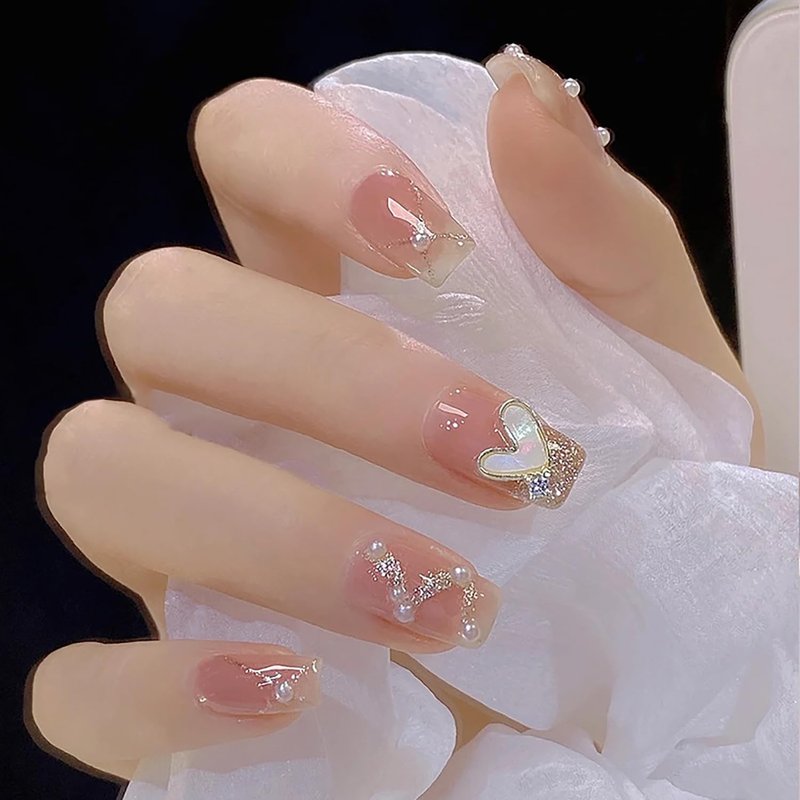 Heart Charm Press on Nails Short Coffin Nails Reusable Nude Fake Nails with Pearl Diamond False Nails with Glossy Glue on Nails Full Cover Glitter Acrylic Nails for Women Girls 24 Pcs