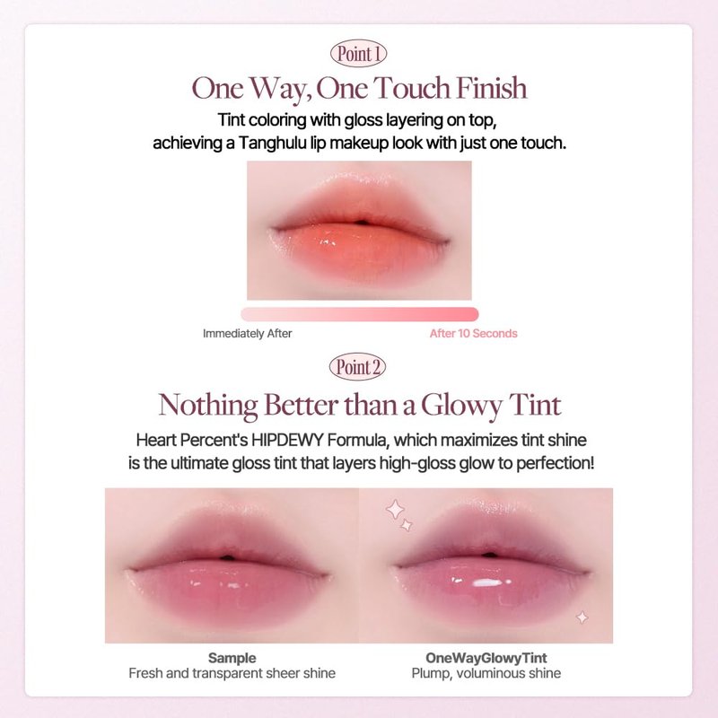 - [Nothing Better than a Glowy Tint] Maximized shine! The ultimate glossy tint. Heart Percent's HIPDEWY Formula, which maximizes tint shine is the ultimate gloss tint that layers high-gloss glow to perfection!