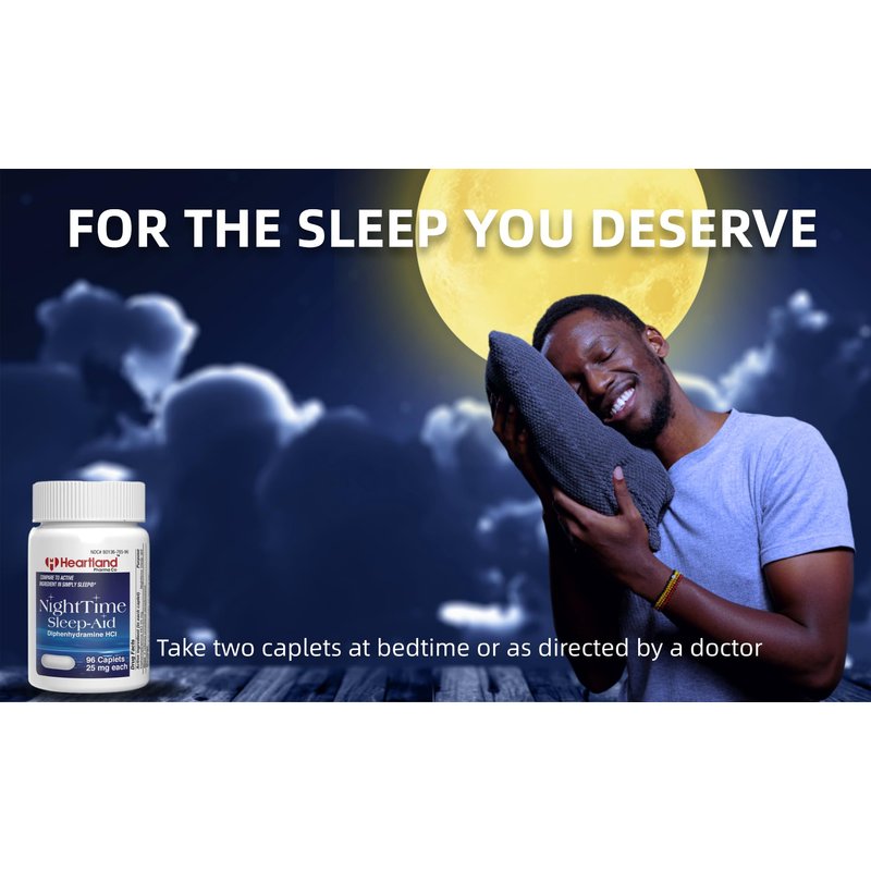 𝐇𝐞𝐚𝐫𝐭𝐥𝐚𝐧𝐝 𝐏𝐡𝐚𝐫𝐦𝐚 𝐒𝐥𝐞𝐞𝐩 𝐀𝐢𝐝 𝐃𝐢𝐩𝐡𝐞𝐧𝐡𝐲𝐝𝐫𝐚𝐦𝐢𝐧𝐞 𝐇𝐂𝐈 𝟐𝟓𝐦𝐠 𝐂𝐚𝐩𝐥𝐞𝐭𝐬 Heartland Pharma Sleep Aid Diphenhydramine 25 mg Caplets will help you fall asleep when counting sheep just isn't cutting it. These sleep aids come in the shape of caplets that act fast, allowing you to drift off into a blissful sleep and wake up rested and prepared to take on the challenges of the day. Heartland Pharma can help when you just need to get some zzzs, a nighttime sleep aid is an excellent option because it doesn't establish habits. Your health and well-being are important to us personally at Heartland Pharma. 𝐏𝐫𝐨𝐝𝐮𝐜𝐭 𝐅𝐞𝐚𝐭𝐮𝐫𝐞𝐬 Made in the USA. Children under 12 do not use it. Do not exceed recommended dose. Adults and children 12 years and over. Compare to the active ingredients in Tylenol Simply Sleep. Take two caplets at bedtime if needed, or as directed by a doctor. 𝐒𝐮𝐢𝐭𝐚𝐛𝐥𝐞 𝐟𝐨𝐫 𝐀𝐝𝐮𝐥𝐭𝐬 𝐚𝐧𝐝 𝐂𝐡𝐢𝐥𝐝𝐫𝐞𝐧 𝟏𝟐 𝐘𝐞𝐚𝐫𝐬 𝐨𝐟 𝐀𝐠𝐞 Heartland Pharma Sleep Aid Diphenhydramine 25mg contains 25 mg of diphenhydramine hydrochloride in each caplet. These nighttime sleep aid pills are suitable for adults and children 12 years of age and older to help relieve occasional sleeplessness. It is non-habit-forming when used as directed.