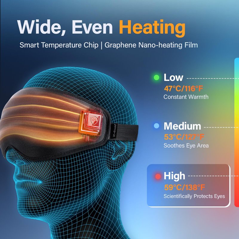 - 𝐋𝐚𝐫𝐠𝐞-𝐚𝐫𝐞𝐚 𝐔𝐧𝐢𝐟𝐨𝐫𝐦 𝐇𝐞𝐚𝐭𝐢𝐧𝐠: Ensures optimal comfort for your eyes while providing advanced eye protection and combating fatigue. The heating eye mask features an intelligent temperature control chip and nano-level graphene heating film, offering personalized 3-level temperature settings ranging from 116 to 138 degrees Fahrenheit.