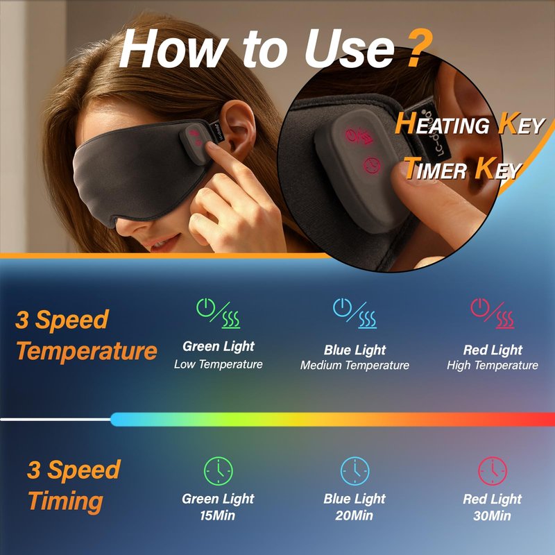 Large-area Uniform Heating: Ensures optimal comfort for your eyes while providing advanced eye protection and combating fatigue. The heating eye mask features an intelligent temperature control chip and nano-level graphene heating film, offering personalized 3-level temperature settings ranging from 116 to 138 degrees Fahrenheit. AI-3DSCAN TECH's Light-blocking Structure: Sleep Mask Utilizes a 5-layer sponge design with superior light-blocking properties, seamlessly formed using 720S heat-pressing technology. This design conforms perfectly to facial contours, particularly around the eyes and nose, achieving an exceptional light-blocking rate of 99%. Convenient Timing and Safety Features: The eye mask charges in just 2 hours and provides 90 minutes of uninterrupted use. It offers 3 timing options (15, 20, and 30 minutes) for added convenience and automatically shuts off for safety. Perfect for home use, short trips, commuting, office naps, and quick energy recovery. Unmatched Comfort: Carefully selected fabric layers provide a blend of light-blocking, heat therapy, moisture absorption, and breathability. The ultra-thin (0.5mm) non-slip headband ensures a barely noticeable fit, suitable for head circumferences ranging from 45cm/17.7" to 62cm/24.4". Versatile Solution for Every Need: The 3-in-1 combination includes a graphene cordless heating eye mask, a regular graphene sleep mask, and a gel strip for cold therapy. Use the heated eye mask to relieve eye fatigue, the regular eye mask for everyday sleep, and the chilled gel strip for soothing swollen or dry eyes upon waking.
