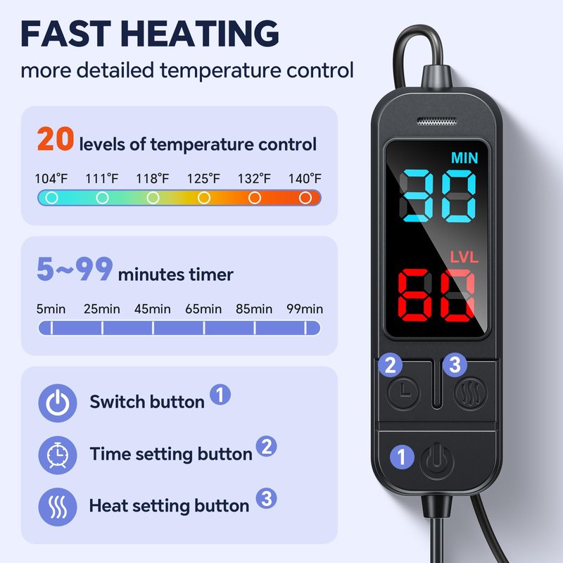 - 20-Precision Heat Levels: Fine-tune from cozy 100°F to deep-relax 156°F (in 2.8°F steps), adapting to your daily needs – gentle mornings, work breaks, or post-workout recovery.