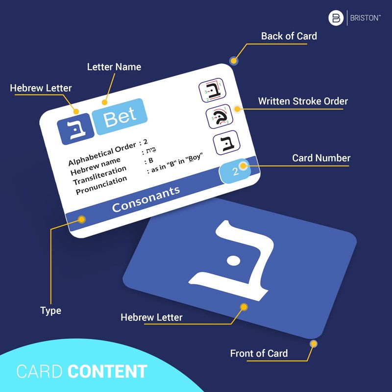 Through Hebrew flashcards, start learning Hebrew from the beginning. This pack includes the complete alphabet of Hebrew, including their English replacement, alphabetical order, and pronunciation guidance. Developed after extensive research and consultation with top-tier native speakers. Briston alphabet flashcards are a great step toward your excellence in Hebrew, covering all the aspects that are beneficial at a basic level.
