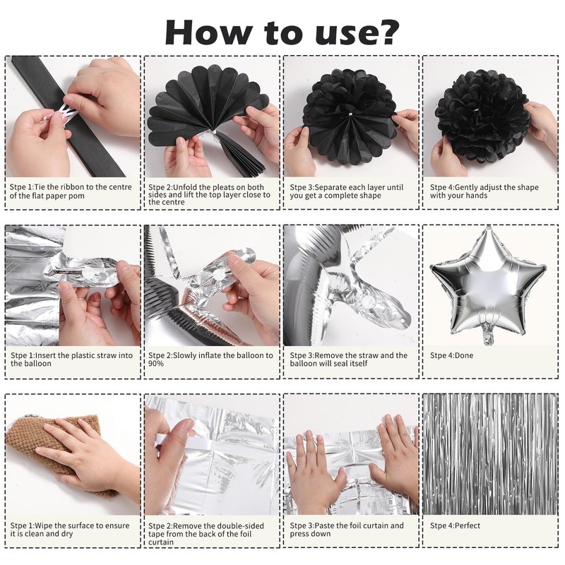 - Black and Silver Birthday Decorations: Our black party decorations kit includes everything you need to create a stunning party. It contains 30pcs latex balloons (black*10/white*10/metallic silver*5/confetti silver*5), 2pcs star balloons, 1pcs happy birthday banner, 1pcs foil fringe curtain, 6pcs tissue paper pompoms, 1pcs star garland, 1pcs cake topper, 1pcs ribbon, 1pcs balloon garland strip, and 1pcs large eye threading needle