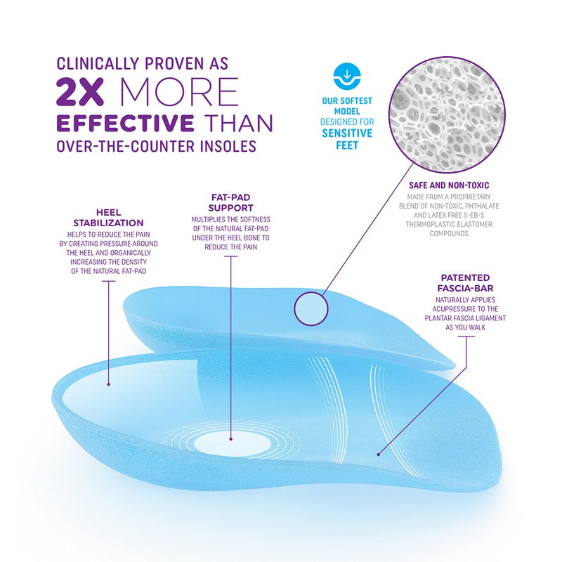 Give your heels a break with these with these daily-wear orthotic heel cups. Gel Heel Seats will keep your feet comfortable wherever life takes you. Treat your feet to the support and plantar fasciitis relief you need today. Get relief for your heel pain! Have sensitive feet? Gel Heel Seats are designed for you. These non-prescription inserts sit inside your shoe and support your heel and feet. Whether you’re sprinting, walking to the bus, or standing still at your job, these inserts will allow you mobility freedom. Simply slip them into your shoes and go. 360-degree motion control and support your sensitive feet. Get in your 5,000-10,000 steps or just feel great during your daily routine. Orthotics fit easily into any closed heel shoe. Toss them into the washing machine for easy cleaning. Clinically-proven and backed by science to help prevent or relieve symptoms for plantar fasciitis, shin splints, tendonitis, heel spurs, and other disorders in an all-natural way. Experience pain relief within 1-8 days of regular use whether standing, walking, or running. Heel Seat customers report over 90% satisfaction using our patented Fascia-Bar insert to resolve heel pain. Say goodbye to the pain, and hello to a more active you. If you’re looking for more support, try our original Heel Seats Foot Orthotics.