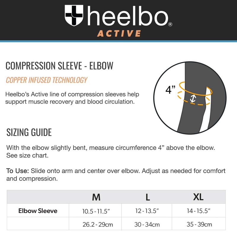 - COMPRESSION ELBOW SLEEVE Sizing: Measure circumference of the upper arm, about 2-3 inches above elbow. Medium 10.5-11.5 inches; large 12-13.5 inches; XL 14-15.5 inches