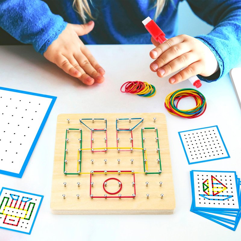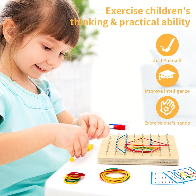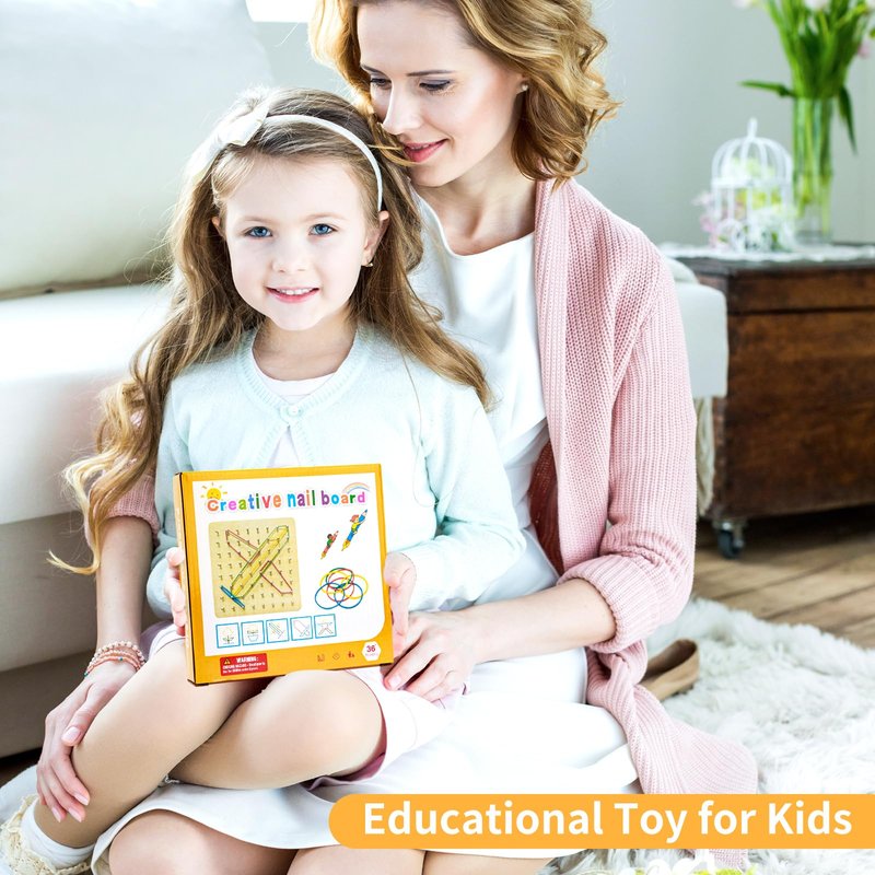 - Parent-children Interactive Toys: Be helpful for kids to develop fine motor skills and hand-eye coordination through manipulating the rubber bands into the nails.It’s great for learning math and literacy skills by identifying geometry shapes and letters along with forms. Learn about polygons for analytical kids and other shapes for imaginative and creative kids.