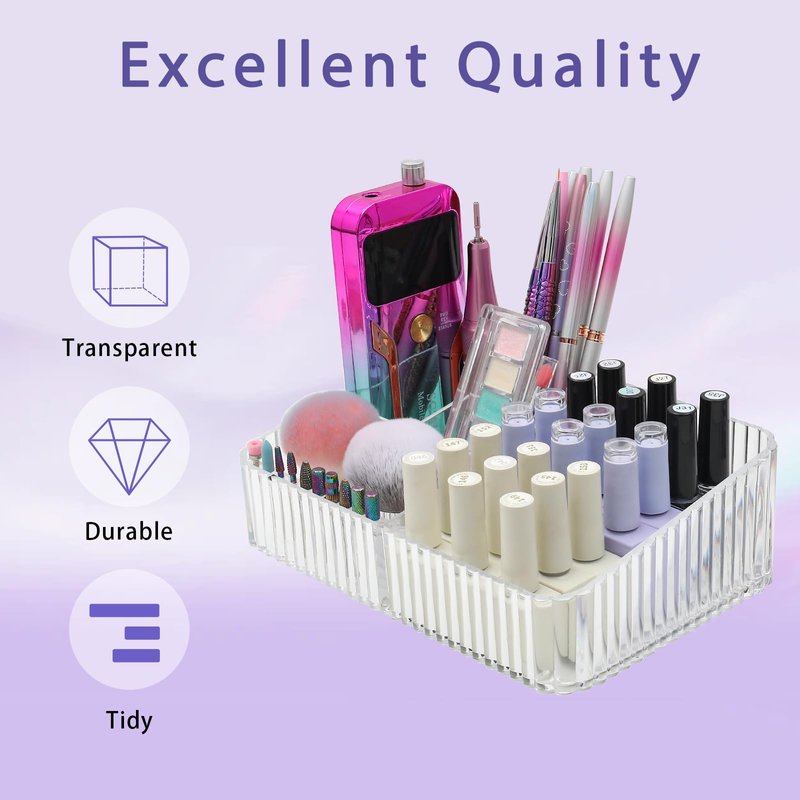 - 【Exquisite Five-Slot Design】This nail organizer and storage tray features 5 compartments and a removable 10 holes nail drill bits holder, the left layer with 4 small compartments for holding small nail tools, such as nail drill machine, sanding bands and nail file, and so on. The right layer with a big compartments for storage big nail tools, such as nail wipes, nail polish as well as other nail must haves.