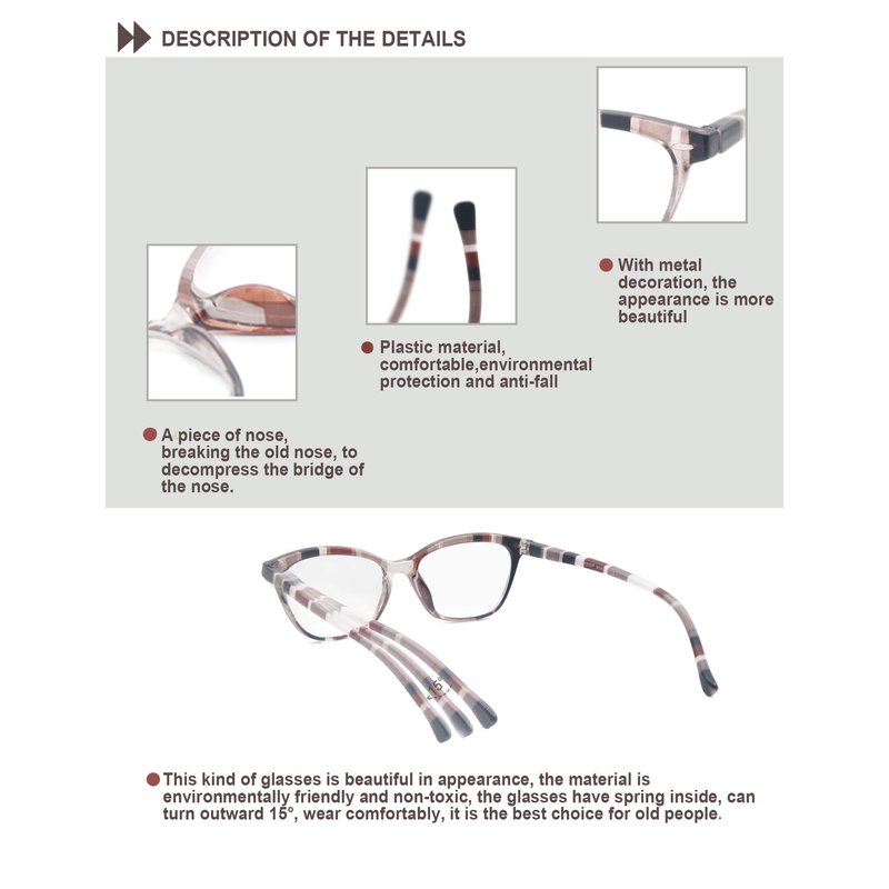 - {Spring Hinge Design}: Durable spring hinge on the arms with reading glasses, lighter in weight and will not feel uncomfortable for a long time,fits most head sizes