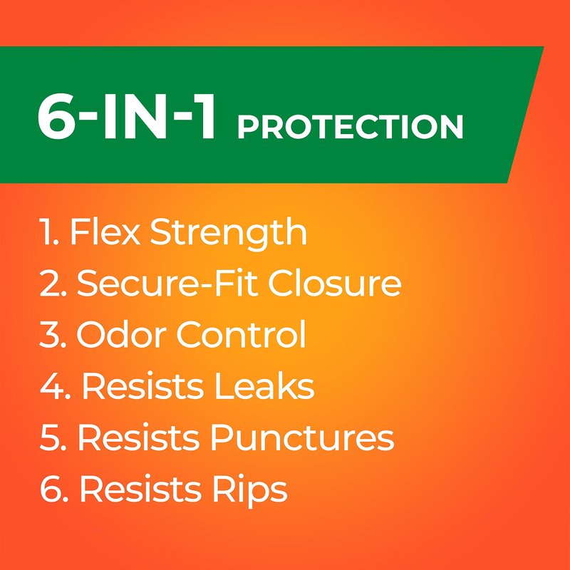 - 6 IN 1 PROTECTION—These flexible trash bags offer a powerful combination of six features that keep garbage where it belongs: flex strength, tough drawstring, patented odor control, resistance to leaks, puncture protection, and rip defense