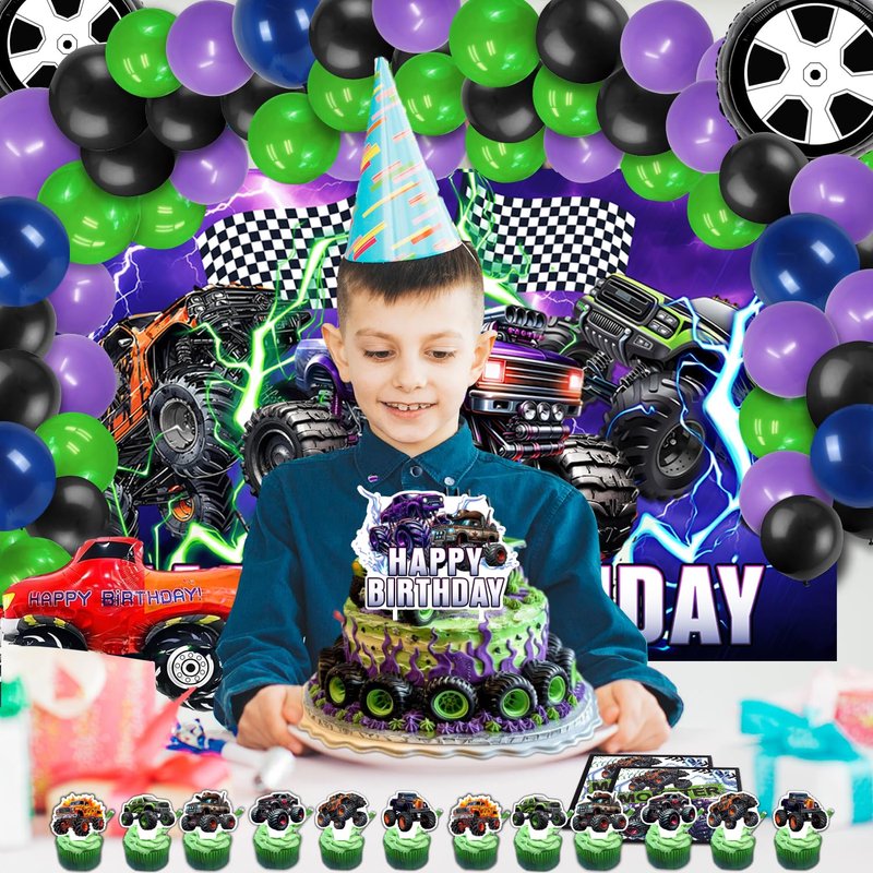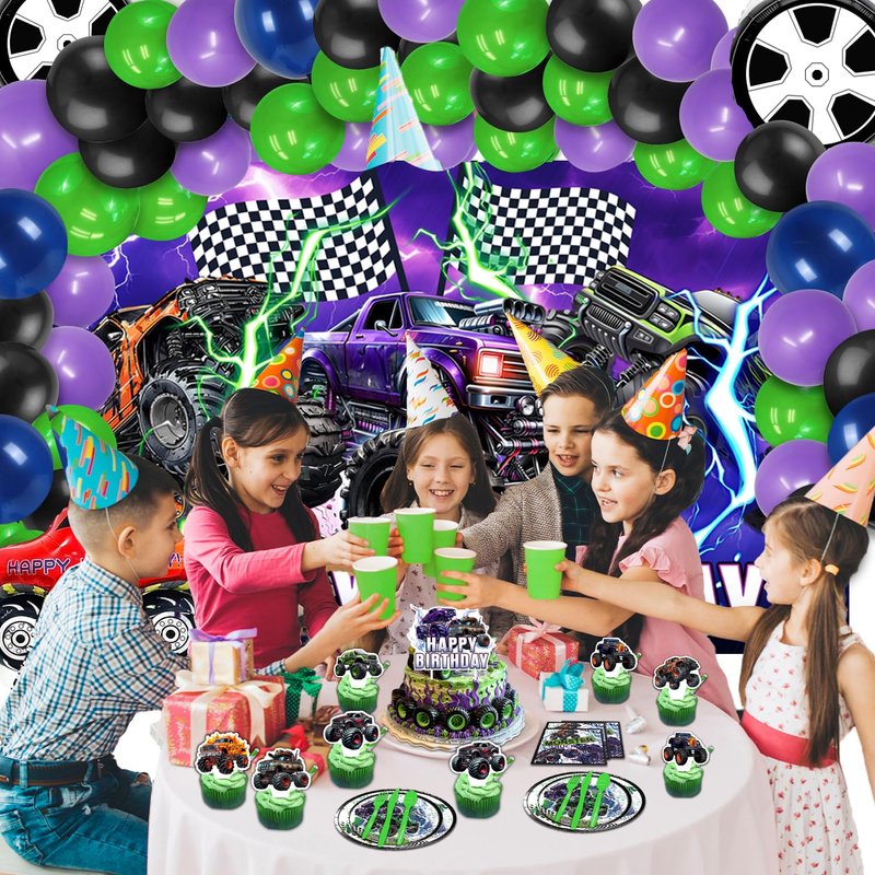 - 🎉【Products include :】 1 Monster truck background,60 Monster truck balloons, 1 Monster truck tablecloth, 10 9-inch plates, 10 7-inch plates, 20 napkin,10 forks and spoons each, 1 Happy Birthday cake toppers, 12 Monster truck cupcake toppers., 2 tire balloons,1 balloon chain,1 dot glue,1 knotter