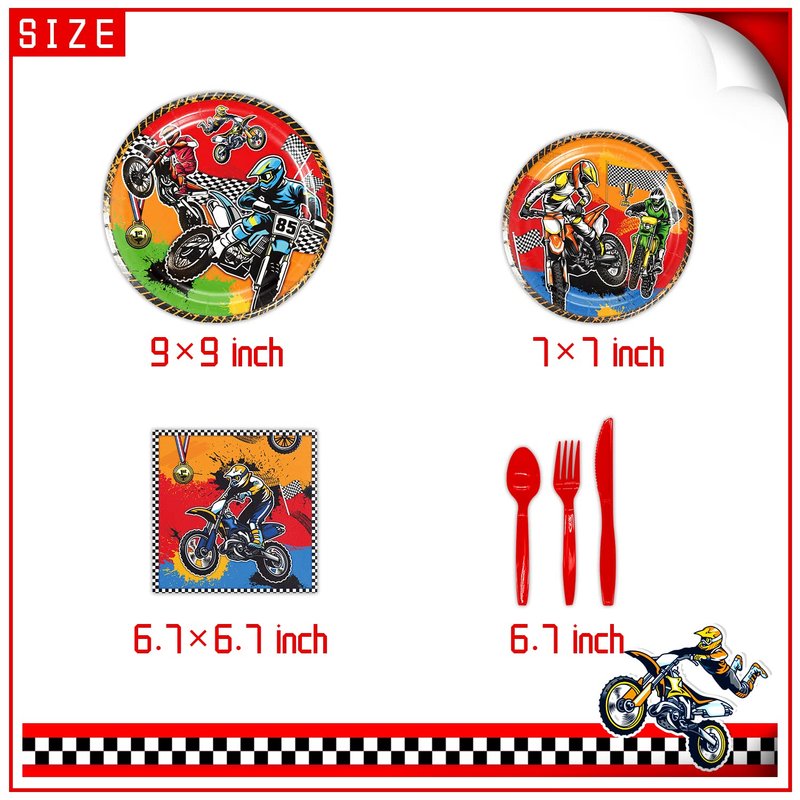 【Products include :】 1 happy birthday banner, 1 dirt Bike background, 18 balloons, 1 dirt Bike tablecloth, 10 9-inch plates, 10 7-inch plates, 10 forks table knife and spoons each,20 napkins 1 happy birthday cake toppers, 12 dirt bike cupcake toppers.