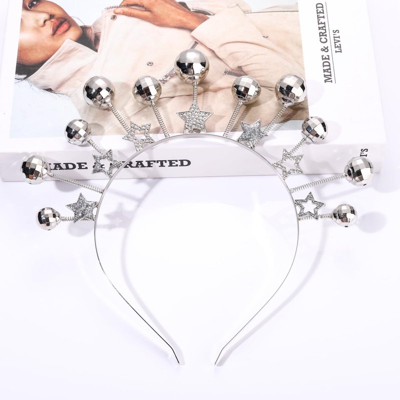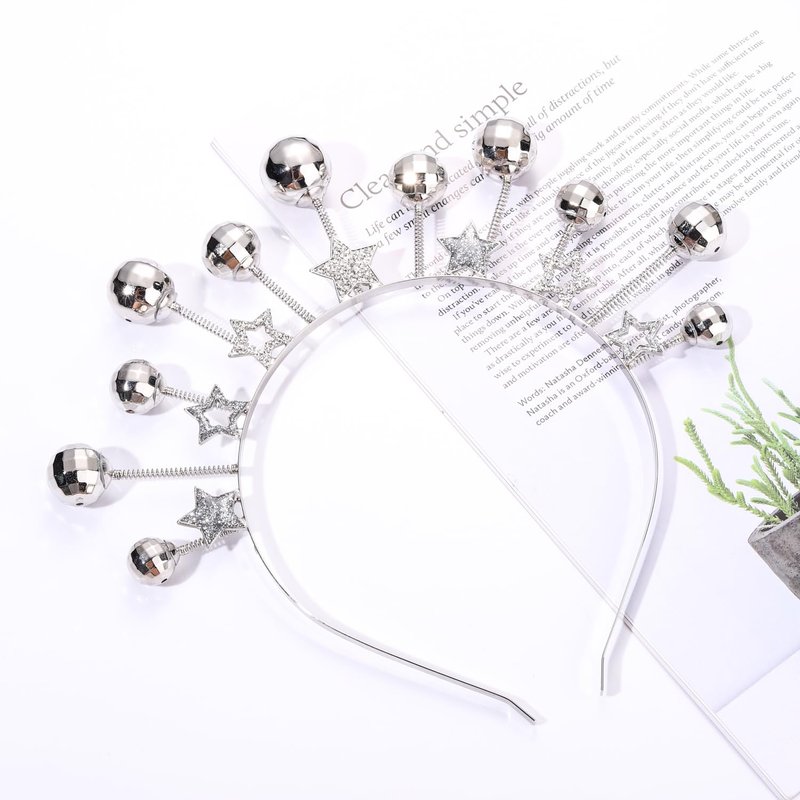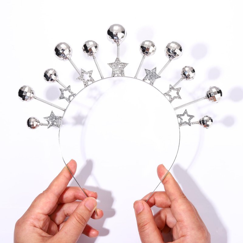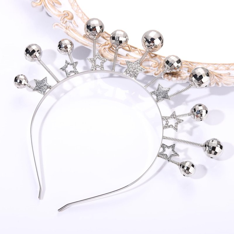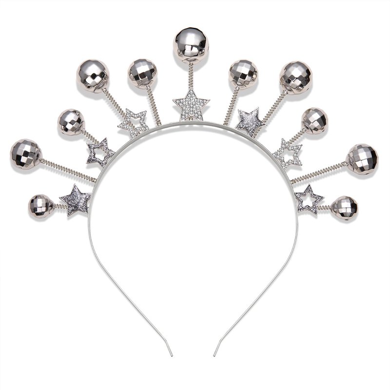 - Mirrorball & Rhinestone Star Headpieces--This silver Vintage disco ball themed headband features rhinestone stars and glitter stars are fixed on the alloy hoop,and the silver disc ball is fixed with a spring,when worn on the top of the head,the silver balls boppers is wobbly,very interesting.
