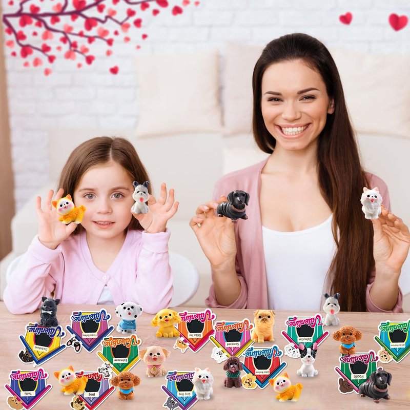 Heirloom Haven 24pcs Valentines Day Gift Cards with Toys, Valentines Toys for Kids Miniature Resin Puppy Dog Figurines Greeting Cards for Classroom Exchange Prizes, Valentine Party Favors Supply