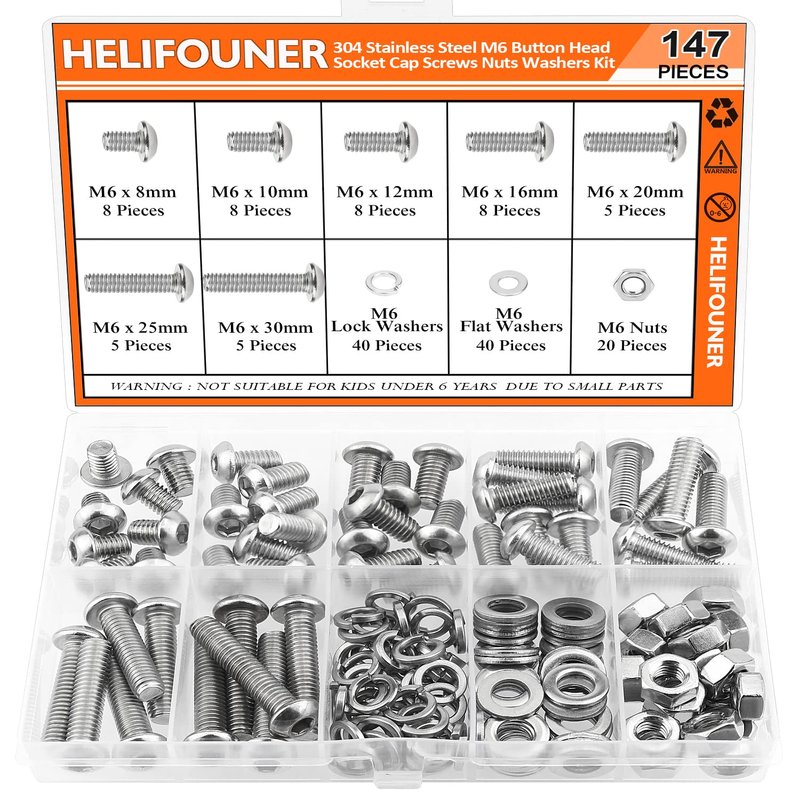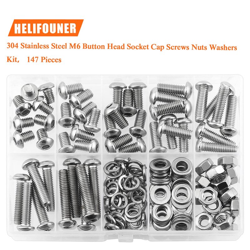 HELIFOUNER 147 Pieces M6 x 8mm /10mm /12mm /16mm /20mm /25mm /30mm, Button Head Socket Cap Screws Bolts Washers Nuts Kit, 304 Stainless Steel