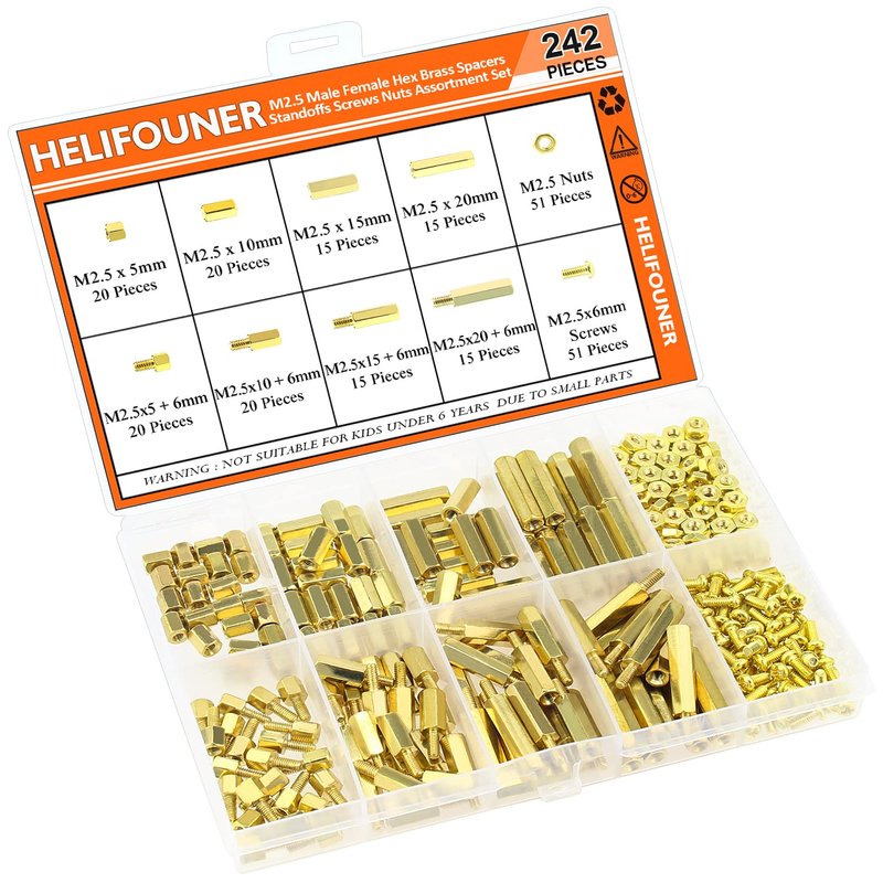 - 【Sizes】M2.5 brass female to female length is 5 mm, 10 mm, 15 mm, 20 mm; The screw size is m2.5x6 mm, the thread pitch is 0.45 mm, total 242 pieces/10 sizes of the most commonly used spacer in a plastic case, different size can satisfy your different needs.