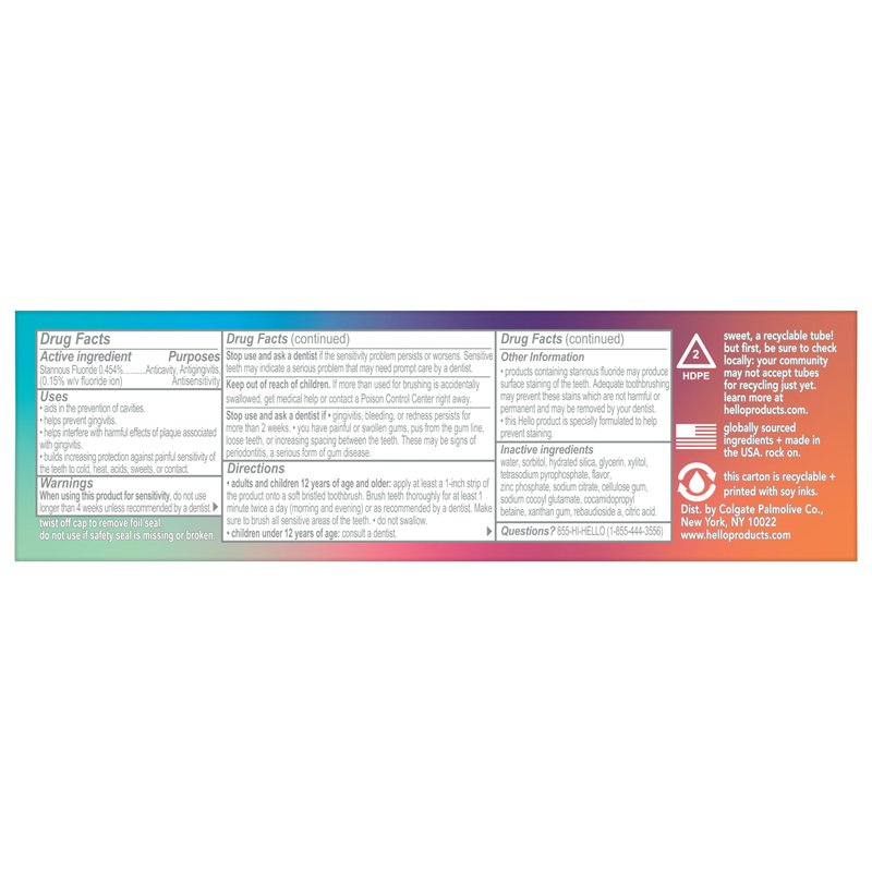 - This 8-in-1 hello toothpaste with fluoride helps crush cavities, tartar, plaque, gingivitis, tooth sensitivity, strengthens enamel, and whitens teeth