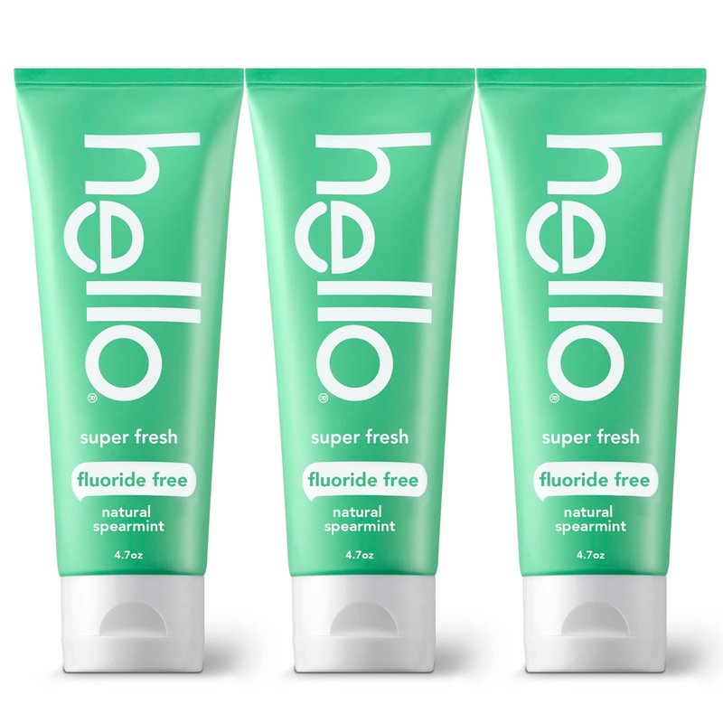 - Includes three 4.7 oz. tubes of Hello Super Fresh Whitening Toothpaste, Fluoride Free Natural Spearmint Toothpaste