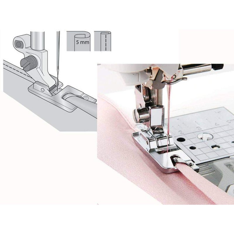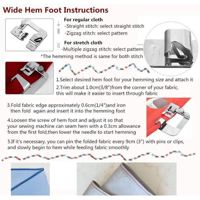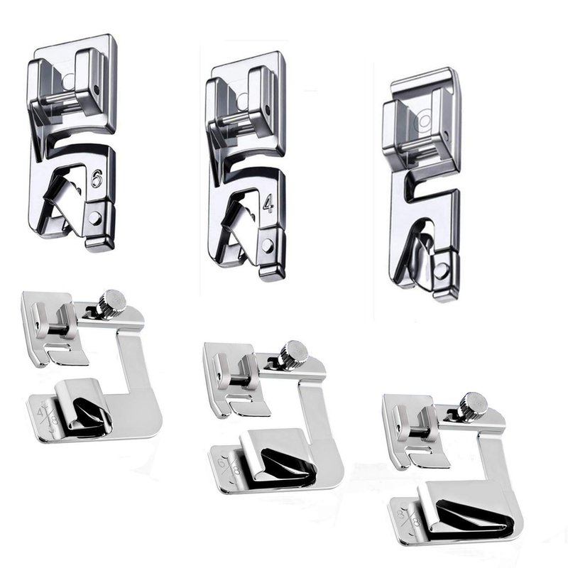 - HEMMER FOOT is definately a useful tool for domestic fabric hemming,now you'll have a kit of 6pcs hemming foot with no time,package includes 3pcs wide rolled hem presser foot(4/8,6/8and 8/8 inch)and 3pcs narrow sewing foot hemmer(3,4 and 6mm)