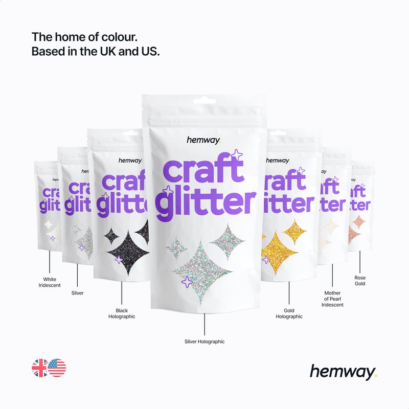 Hemway adds sensational sparkle to arts & crafts projects. Specially designed with crafters in mind, this glitter is made to stick to glass decorations, tumblers and homemade cards with ease. The glitter flakes reflect and disperse vibrant colorful light to create wonderfully eye-catching designs. High color concentration of the glitter and fade resistant properties keeps colors bright and long lasting. Fade Resistant, Skin Safe, Vegan & Cruelty Free and Multi-Purpose.