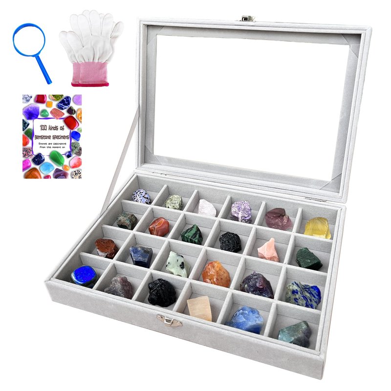 - Thoughtful Gift for Kids: Our display case doubles as a thoughtful gift. Ideal for special occasions, surprise collectors, or anyone who cherishes crystals and gems. A gift that reflects care in design and functionality. Package includes: 1 x Rock Storage Box, 1 x Handbook About Gem Knowledge, 1 x Gloves & 1 x Magnifying Glasses.