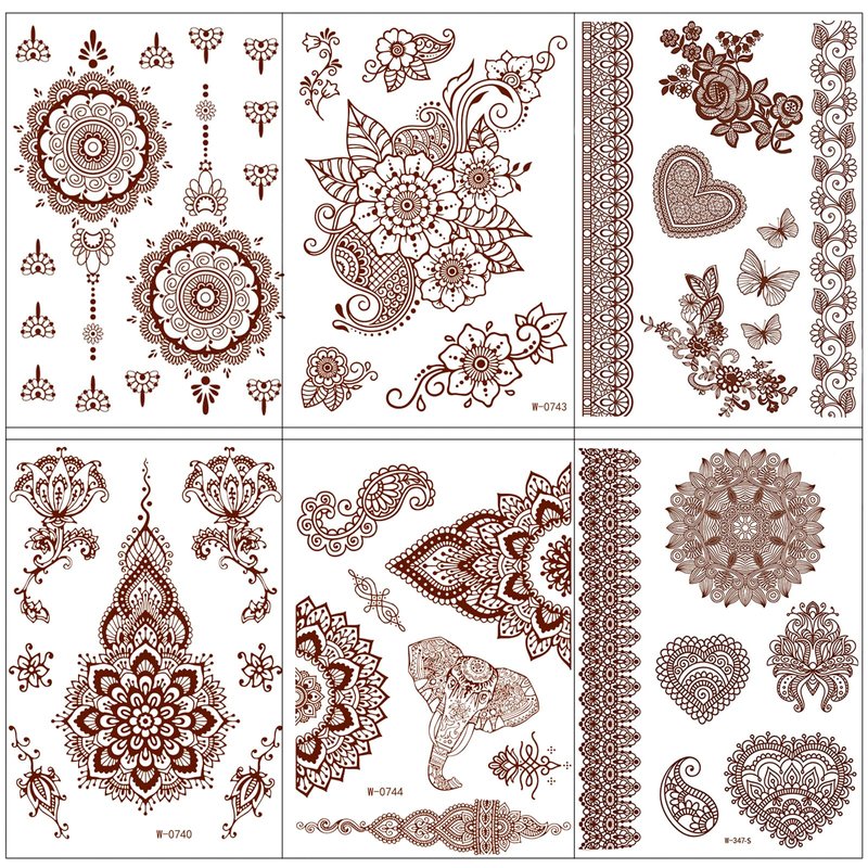 Henna Tattoos 6 Sheets Brown Henna Temporary Tattoo Stickers Waterproof Sexy Fake Tattoos Brown Henna Tattoos Sticker for Women Girls DIY on Body Face Arms Legs Decoration