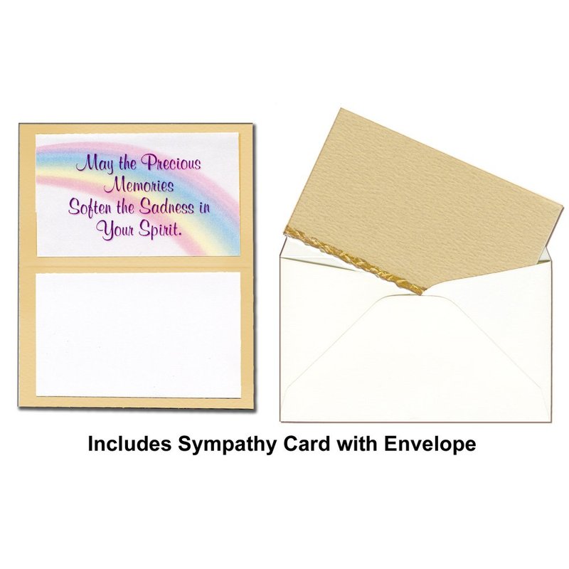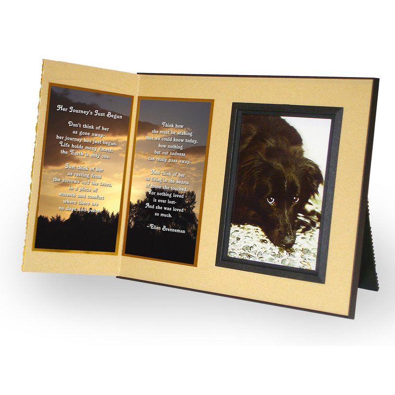 It's hard to know what to say when family, friends or colleagues lose a beloved animal companion. Ease the heartache of pet loss by sending your condolences and support with a memorial keepsake gift. This special remembrance uniquely combines your chosen verse and a photo frame. Like a greeting card, a panel opens to reveal the sentiment you have selected. The space next to it holds a favorite photo of the pet. This gift is made of a composite of materials... quality textured cardstock, embossed and higlighted with foil accents...all assembled on to a sturdy polyresin easel-back. It's designed and sized to sit on a desk, credenza or nightstand. It's a complete gift, with a matching gift box and gift card for your personal message or signature. It reflects your thoughtfulness and, at the same time, is easy to send. NOTE: This option Includes custom photo editing of the pet's photo providing you send a workable image along with the pet's name.